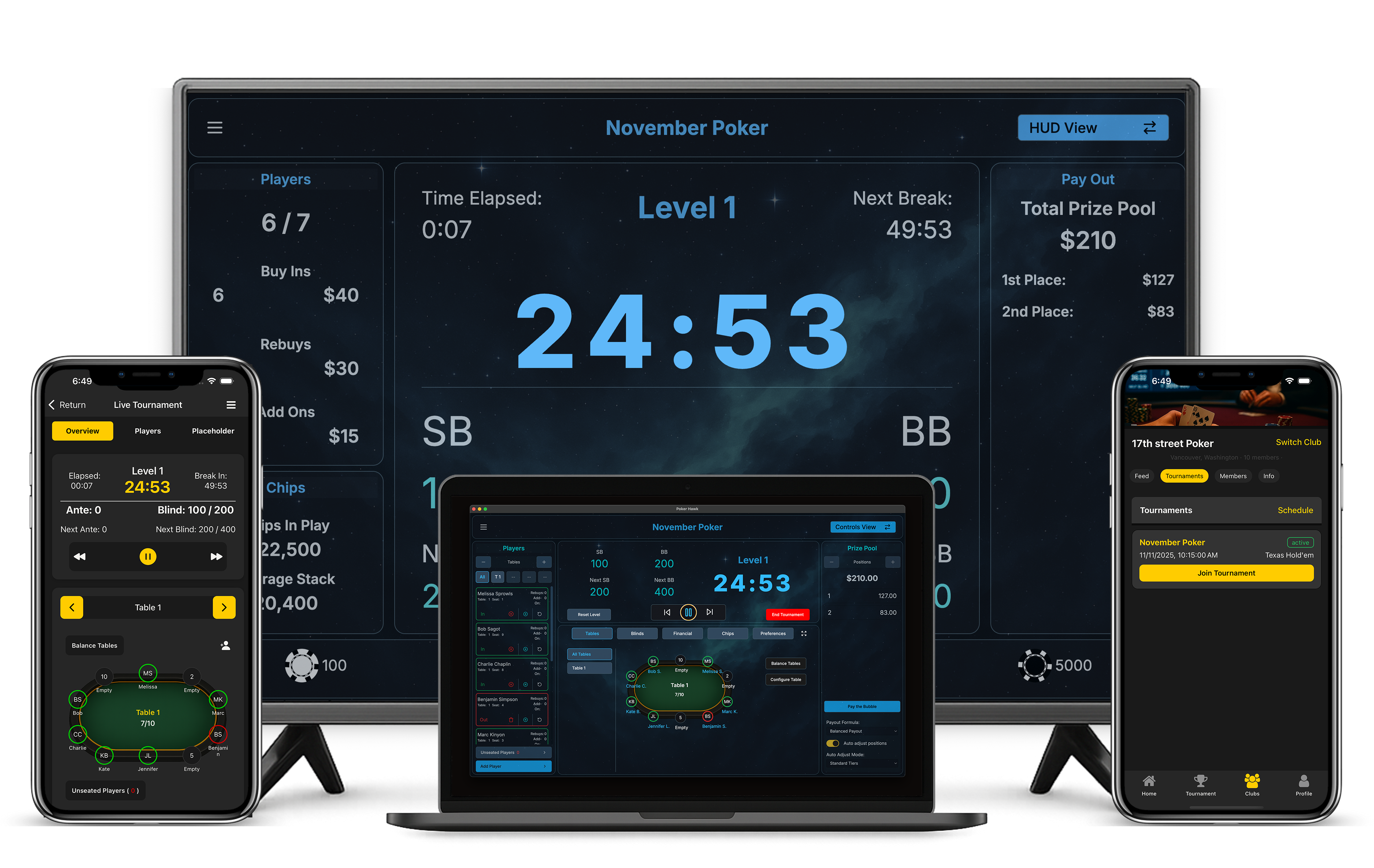 Run tournaments with precision using fully synchronized controls across Desktop, Mobile, and TV. Adjust levels, record eliminations, update prize pools, and more.